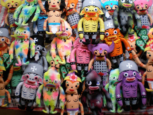 10 x Kim Jong Il – 10 x Soldier Girls (with Colt M4 Rifle and removeable bulletproof vest and helmet) – 6 x Space WItches – 6 x Crab Princess – 13 Michael Jackson and family (including Bubbles the Chimp) – 6 x Dennis Ferguson (Dont know who that is? Look him up!) – 6 x Ayatollahs and many more!!Australian-based artist Cupco (Luke Temby) makes his first US appearance here at Metropolis – though he has already developed a near-fanatic following in the states for his one-of-a-kind soft sculptures. As recently featured at Christies Auction House in their Pop Cuture auctions, Cupco has created a universe of morbidly hilarious characters, taking a cartoonish swipe at world religions, pop culture and politics. Reminiscent of underground comix pioneers such as Gary Panter and Charles Burns, Cupco’s soft sculpture pieces marry mythology to Pop Art through the lens of a demented children’s show. To be added to the preview list for this show, please contact Metropolis.